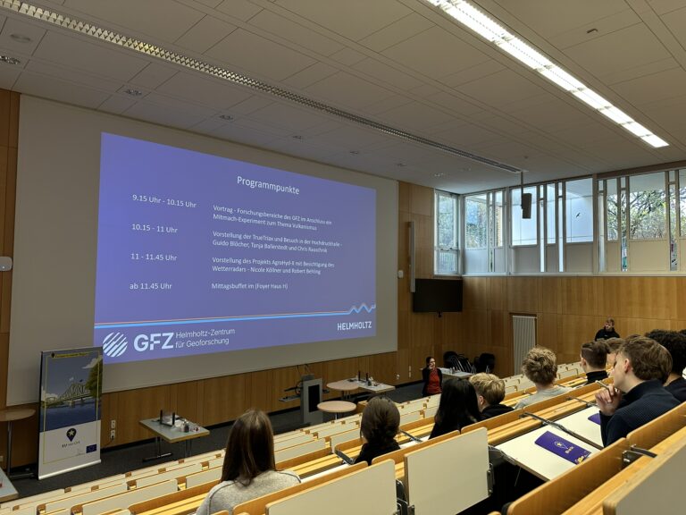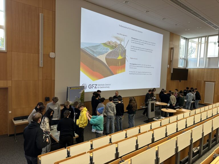 Zum Auftakt erwartete die Gruppe ein fachlich packender Vortrag über Vulkanismus und zentrale Forschungsbereiche des GFZ. Anschließend konnten die Schüler*innen ein Experiment miterleben, das zeigte, wie Geoforscher vulkanische Prozesse untersuchen. Die Mischung aus Wissenschaft, Praxis und direkter Begegnung mit echten Forschenden sorgte für eine intensive Lernerfahrung.