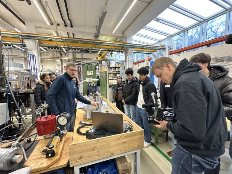 TrueTriax, eine Anlage, mit der Gesteinsproben extremem Druck ausgesetzt werden, um geologische Prozesse realitätsnah zu simulieren, sowie AgroHyd-X, ein Projekt, das hydrologische Daten für nachhaltige Landwirtschaft nutzt. Bei den anschließenden Gruppenführungen konnten die Schüler*innen erleben, wie solche Anlagen aufgebaut sind und welche Bedeutung sie für europäische Klima- und Umweltforschung haben.