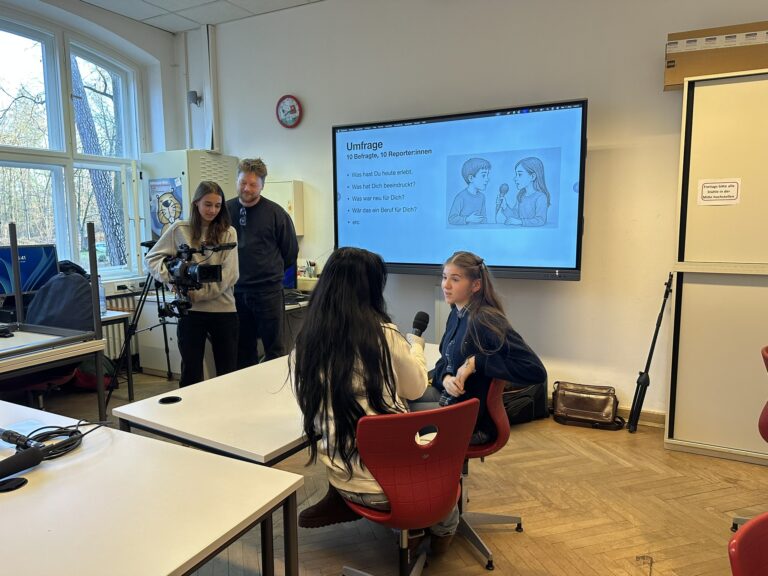 Nach der Mittagspause ging es per Shuttle zurück zum Dreilinden-Gymnasium. Dort startete der praktische Medienblock: ein intensiver Video-Workshop. Die Teilnehmenden lernten, wie Interviews geführt, Szenen geplant und Videomaterial professionell aufbereitet werden. Viele nutzten die Gelegenheit, ihre Eindrücke aus dem GFZ direkt filmisch umzusetzen.
